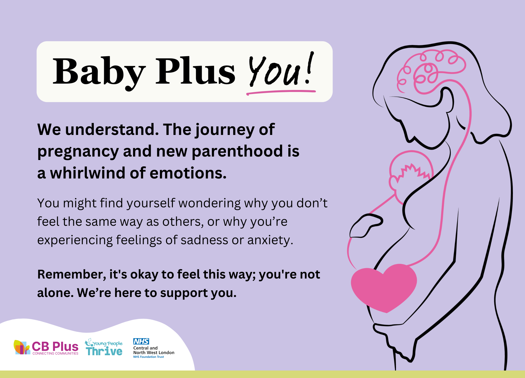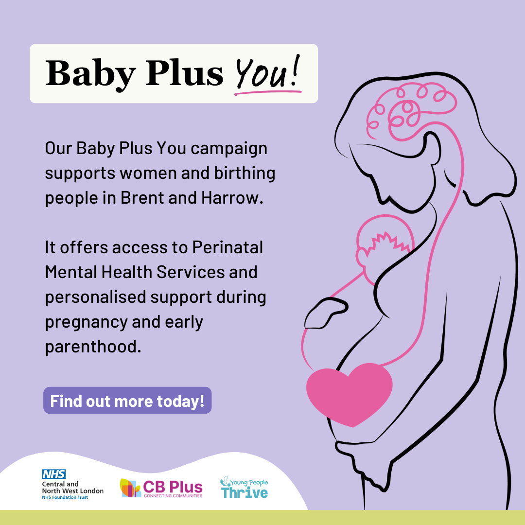 Baby, Plus You is a perinatal mental health project delivered in Brent and Harrow, providing support for all mothers and birthing people during pregnancy and early parenthood. Originally launched under a different name and identity, the project was rebranded to Baby Plus You following a copyright issue.