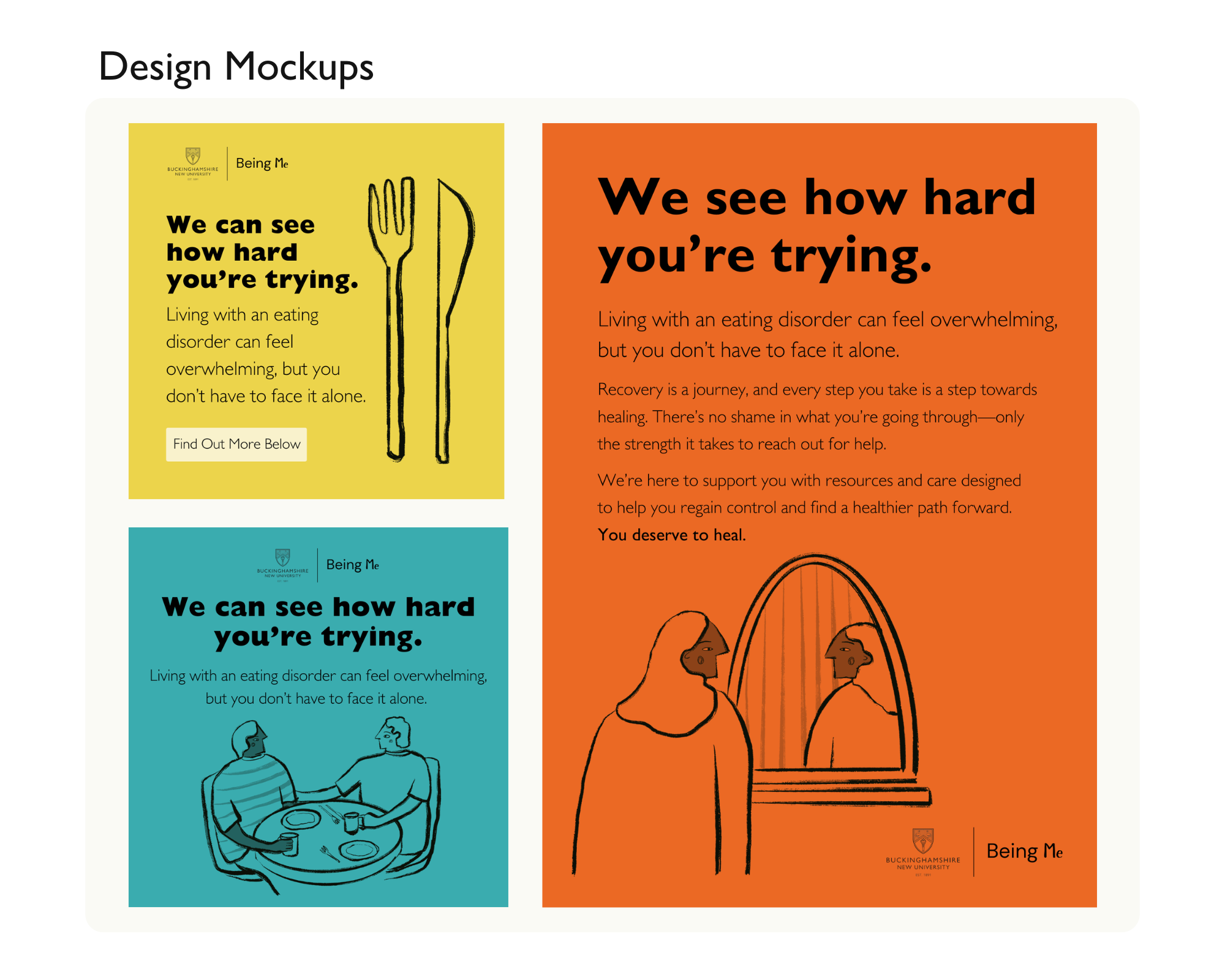 I created a set of bespoke illustrations to bring warmth and relatability to the campaign, aiming to reflect what university-age audiences might find appealing, inclusive, and emotionally accessible. The style is deliberately soft and characterful, complementing the messaging without overwhelming it.
