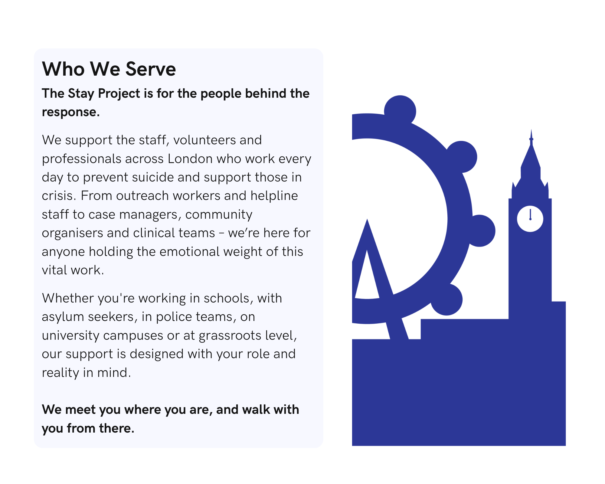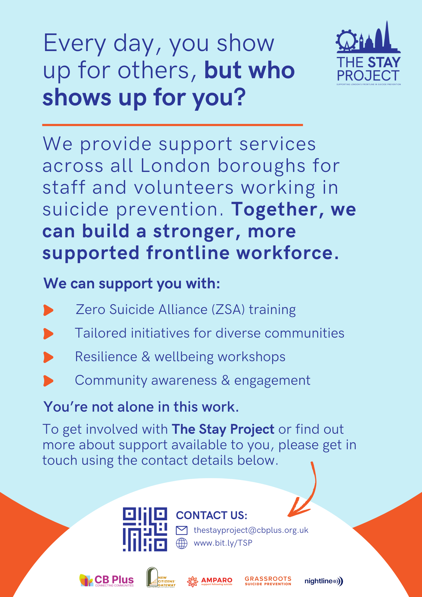 The Stay Project is a London-wide suicide prevention initiative designed to support frontline workers with tailored training, reflective spaces, and practical wellbeing tools. It was developed by a network of specialist partners to address burnout, isolation, and compassion fatigue in the suicide prevention workforce, particularly those supporting under-represented communities across all 32 boroughs.
